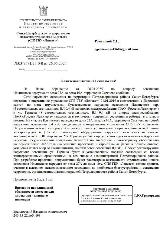 Приложение: письмо СПб ГБУ «Ленсвет».