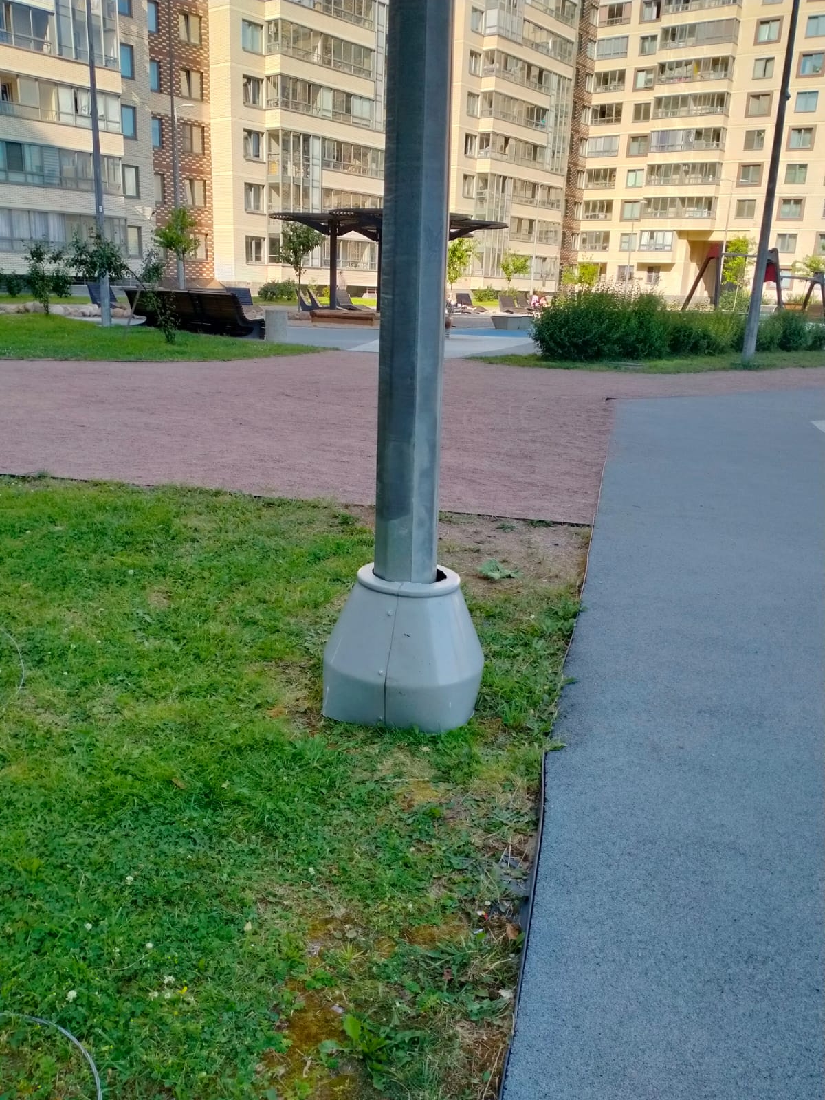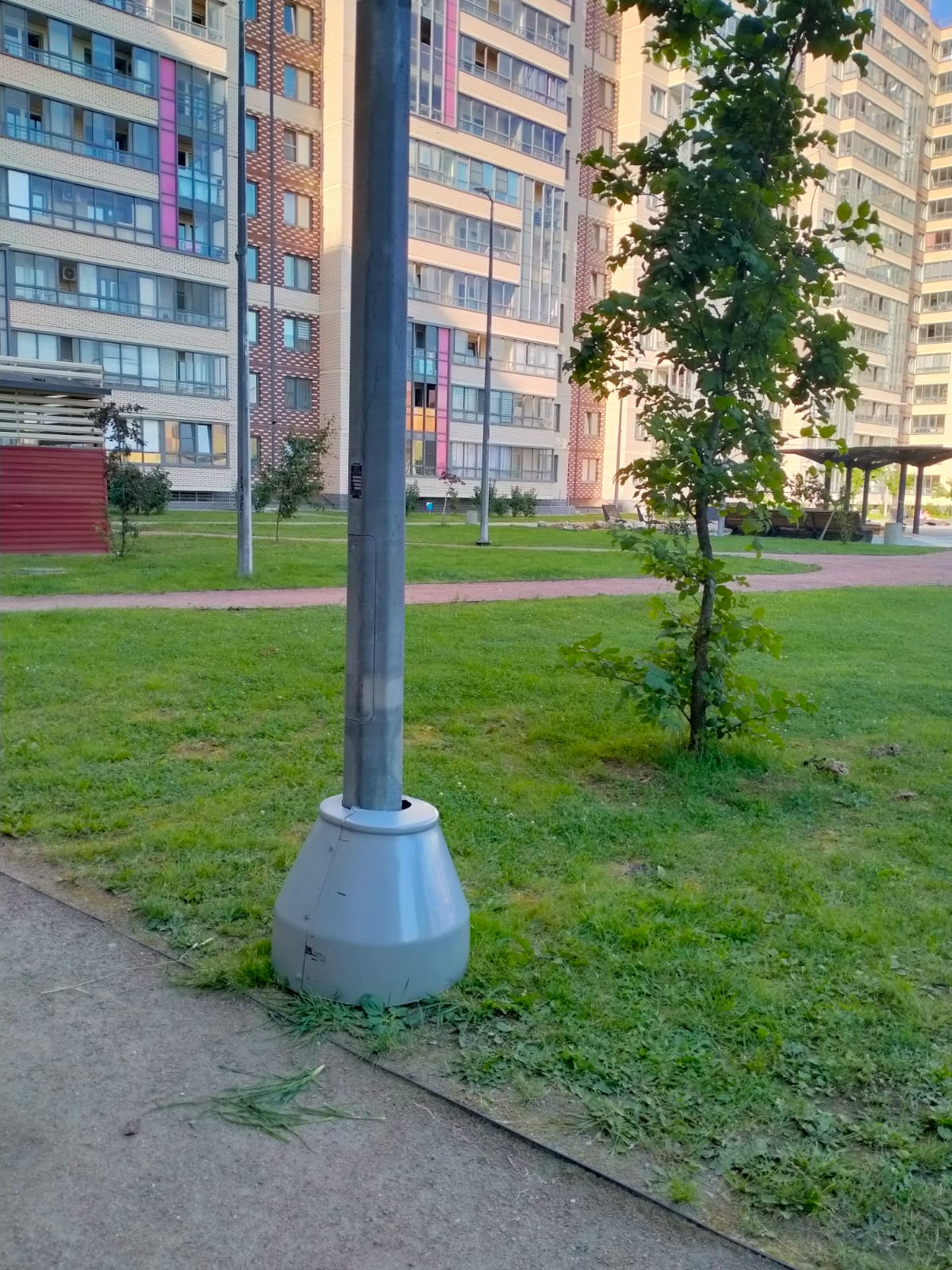 Здравствуйте. На территории( Пулковское шоссе 42/6 и 42/9) имеются 3 детские площадки и они не являются безопасными, тк основания фонарных столбов не закрыты ( выше поверхности земли острые углы основания, гайки, болты и тд). Это является нарушением. Просим закрыть основания столбов защитными колпаками