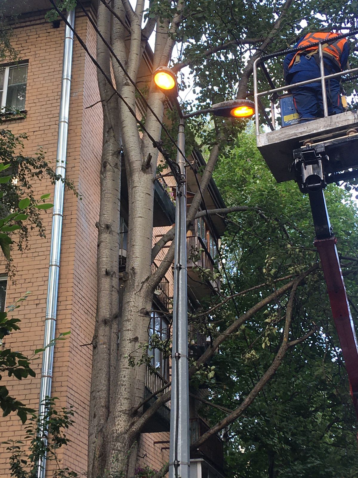 Здравствуйте! Между 3-4 парадной в пролете опор уличного освещения ветки черемухи критически натянули провода . Провода без изоляции !