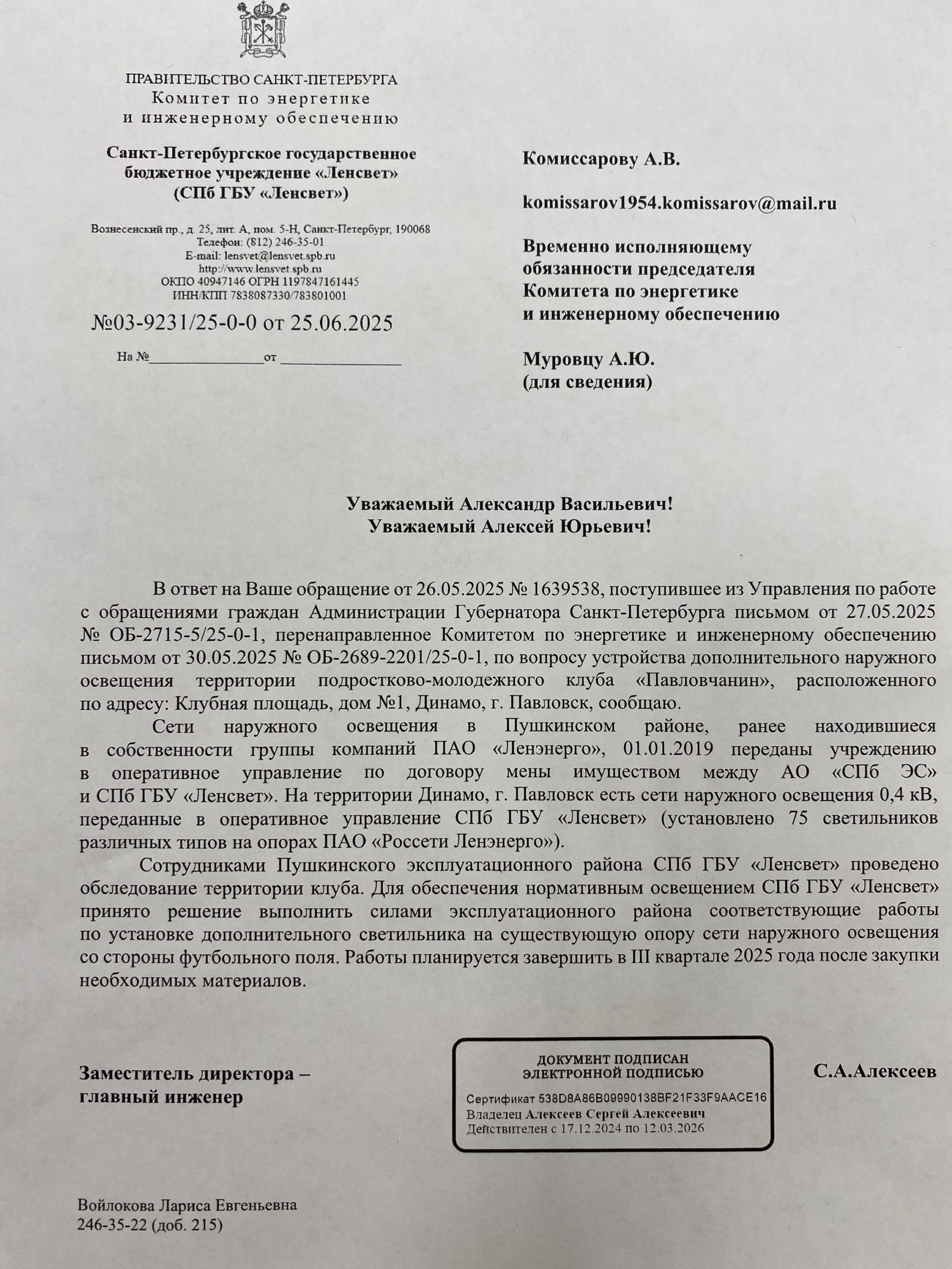 Направляем Вам официальное письмо СПб ГБУ «Ленсвет» № 03-9231/25-0-0 от 25.06.2025 по аналогичному вопросу.