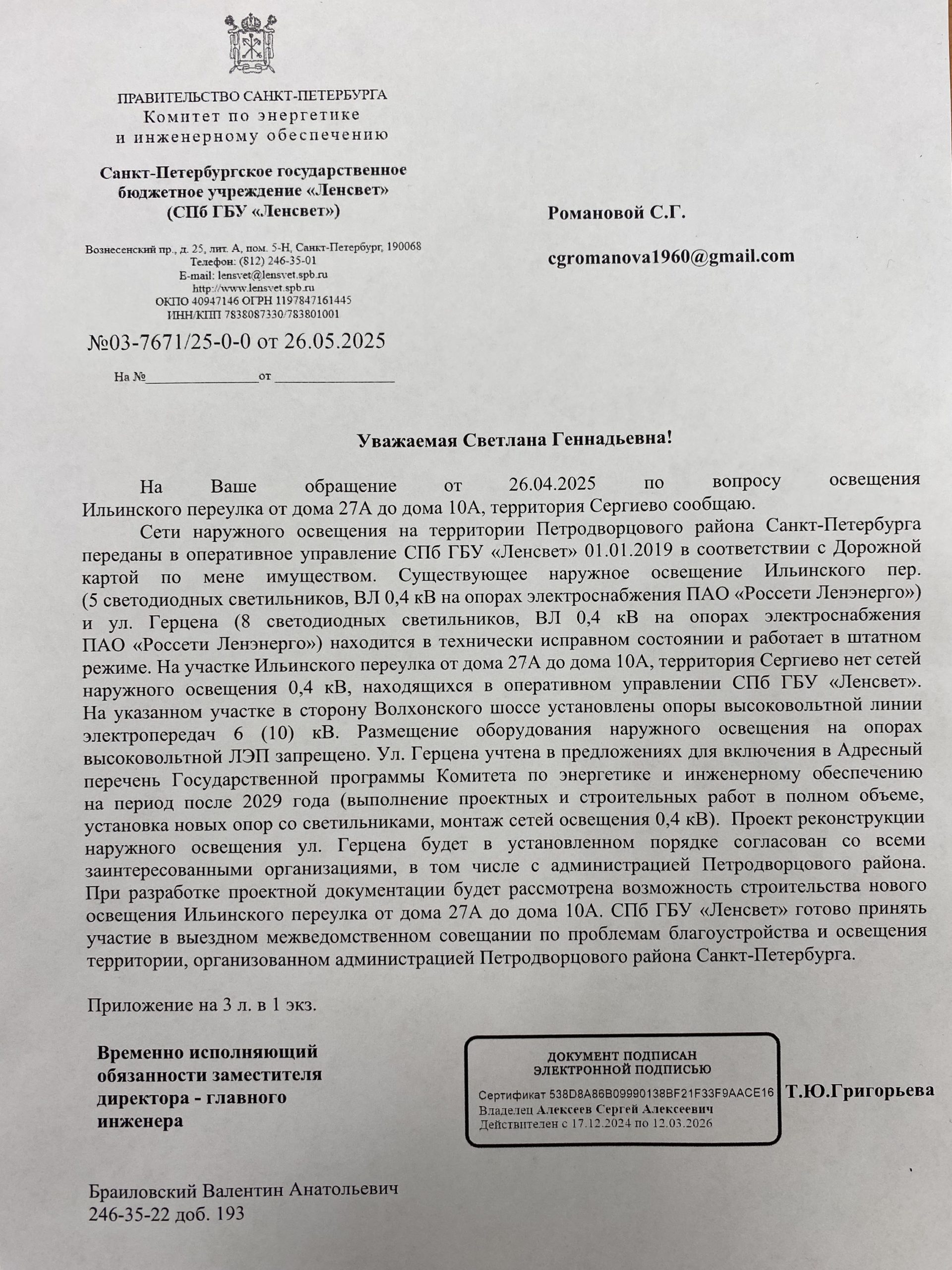 Направляем Вам официальное письмо СПб ГБУ «Ленсвет» № 03-7671/25-0-0 от 26.05.2025 по аналогичному вопросу.