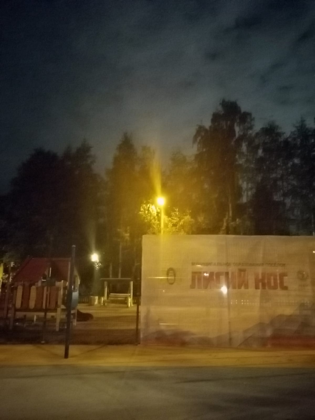 Напротив детской площадки по ул. Стрелковая в поселке Лисий Нос не работает светильник. Фото и карту прилагаю.