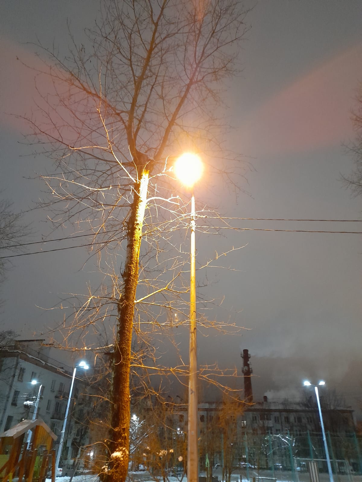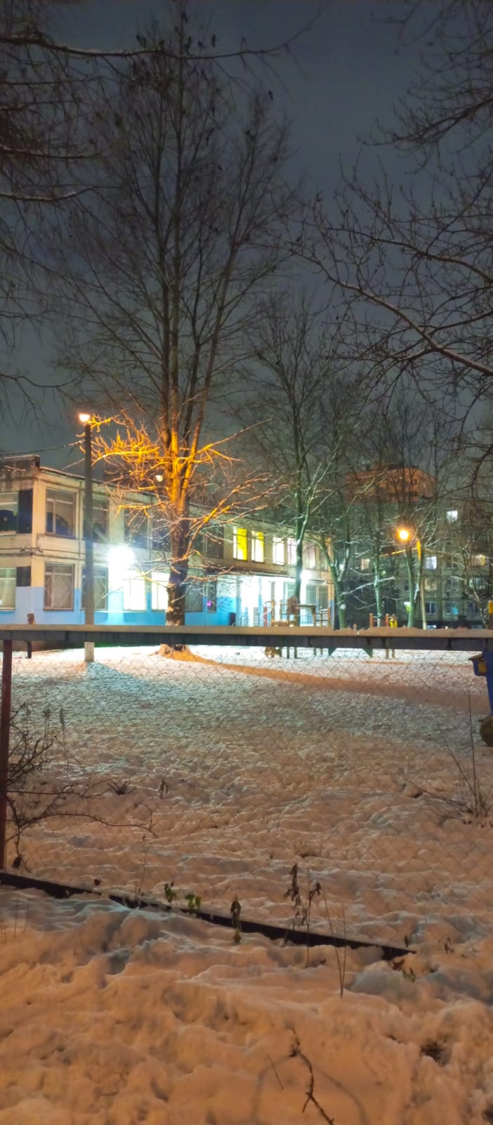 Двор маленький, площадка крошечная, дома низкие, обычные уличные фонари исправно горят. От прожекторов очень яркий сильный свет, как на большом стадионе, бьет в окна всех домов вокруг, переизбыток освещения в ночное время. И уж конечно на площадке ночью никто не играет.
