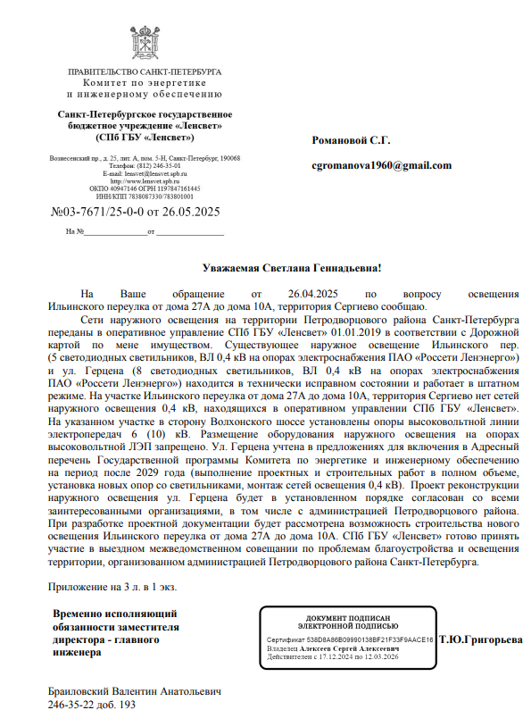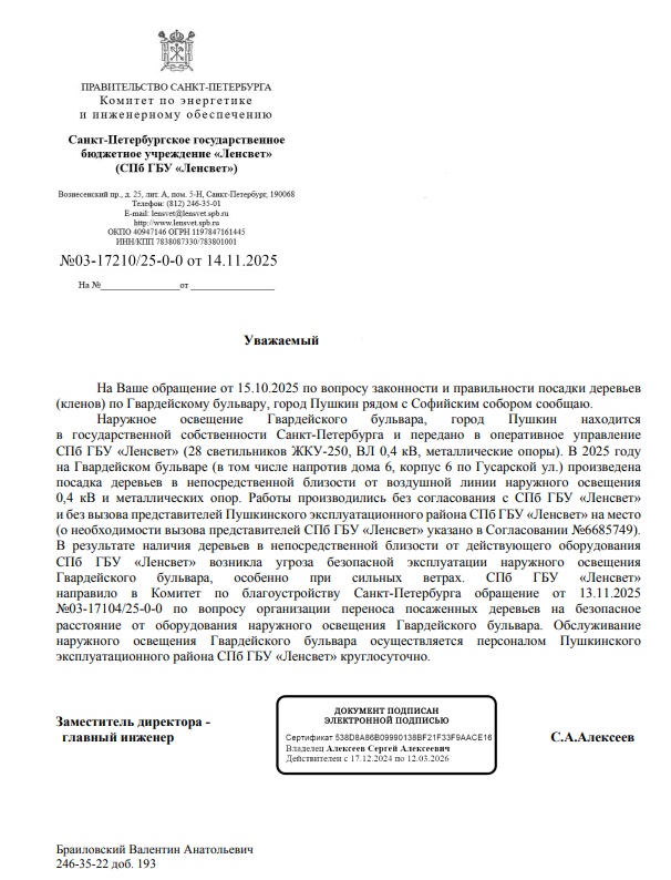 Направляем Вам официальное письмо СПб ГБУ «Ленсвет» № 03-17210/25-0-0 от 14.11.2025 по аналогичному вопросу.